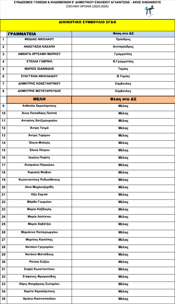 Διοικητικό Συμβούλιο ΣΓ&Κ 2023/24 October 12, 2023October 12, 2023 Constantina KConstantina K 0 Comment Το νέο Διοικητικό συμβούλιο του ΣΓ&Κ για τη σχολική χρονιά 2023/24 Post navigation Previous Previous post: Next Next post: Leave a Reply Cancel replyYour email address will not be published. Required fields are marked *Comment * Name * Email * Website Save my name, email, and website in this browser for the next time I comment.